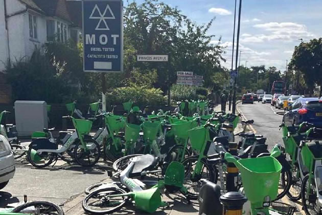 Discarded Lime Bikes on Gunnersbury Lane during a Gunnersbury Park event. Picture: GPGERA